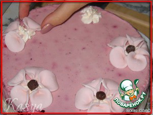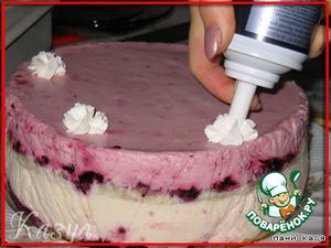 Намечаем взбитыми сливками (я свои не оставила, пришлось из балончика) 5 точек для цветков, можно бы и бока обработать, но я увлеклась верхом...