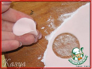 От половинки киндер-сюрприза отрезала донышко - это наш трафаретик для лепестков. Кусочек массы раскатала тонко (делать все пришлось быстро, так как масса быстро сохнет, несмотря на пленку... видимо, я что-то не так сделала). Вырезаем кружок...