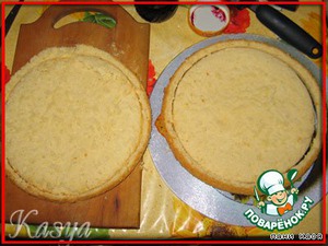 Режем пополам, вырезаем форму того, в чем будем делать торт (я в кастрюльке, поэтому ею и режу)