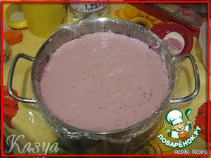 Кастрюльку застелили пленкой, выложили корж, промазали смородиной. Я сразу намазала и 2 корж.