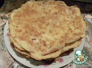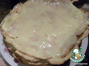 смазываем листы кремом, всего получается 15 листов, т.е. по 7 листов на торт и 1 лист измельчить чтобы посыпать сверху