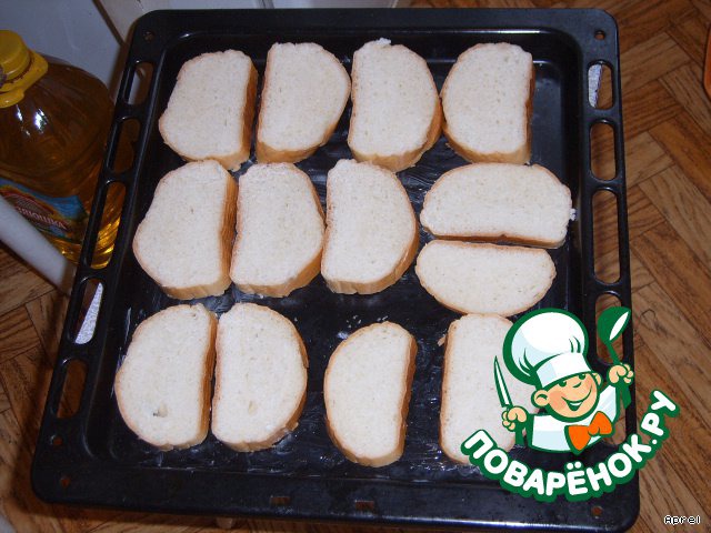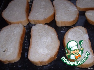 Режем батон на ломтики и укладываем их на противень, у меня поместилось 12 кусочков.