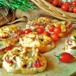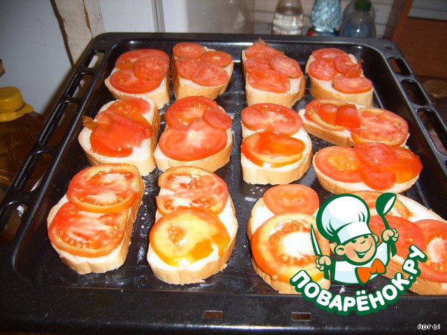 Посыпаем каждый бутерброд тертым сыром. Ставим в духовку минут на 15-20. Температура духовки средняя ( у меня нет термометра). Бутерброды должны зарумяниться.