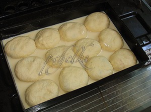 Выложить на противень, смазанный растит. маслом швами вниз и залить заливкой (за идею с заливкой большое спасибо GadenKa): в тёплое молоко добавить взбитое яйцо и сливочное масло, размешать. Не бойтесь, пирожки не будут плавать в заливке, она в процессе выпекания впитывается в тесто, придавая пышность и нежность.