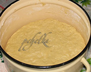 через 2 часа добавить в опару яйца, остальной сахар, растительное масло и муку (сколько возьмёт). Замесить крутое тесто. Оно не должно липнуть к рукам. Выложить тесто в кастрюлю, слегка примять и поставить подходить в тёплое место часа на 2-3, периодически приминать.