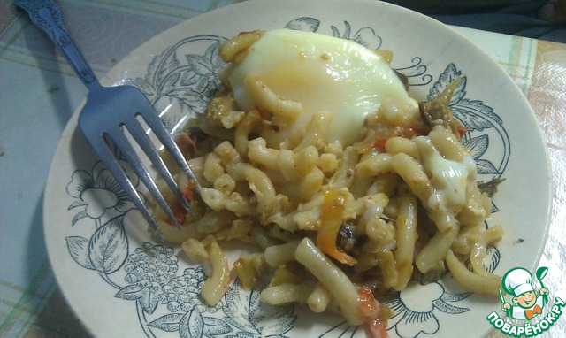 Макароны отварить и слить воду, добавить овощи и тушить 5 минут.