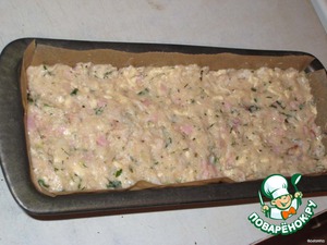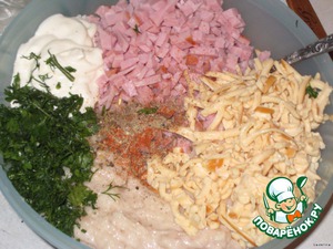 Затем добавить манку, ветчину, сыр, рубленую свежую зелень, соль, паприку, смесь перцев, имбирь, соль. Все хорошо перемешать, чтобы все было равномерно распределено.
