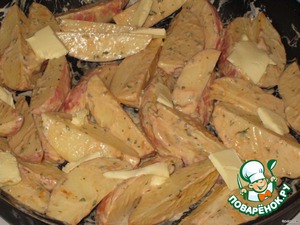 Смешать дольки картошки с этой смесью и выложить в форму, чтобы дольки были в один слой, можно плотно, но в один, сверху распределить кусочки сливочного масла.