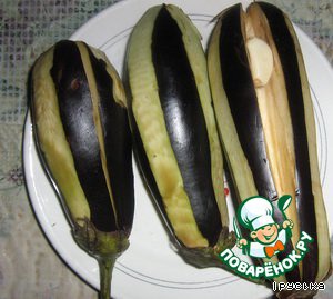 Срежьте с баклажанов полоски кожицы шириной 1 см. На одной из полос сделайте глубокий длинный надрез.