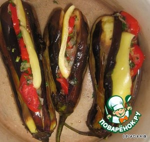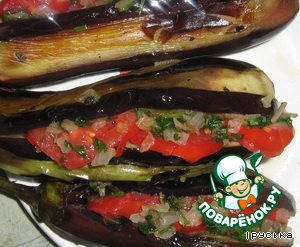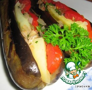 Баклажаны, фаршированные помидорами, луком и болгарским перцем.