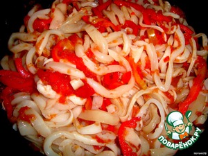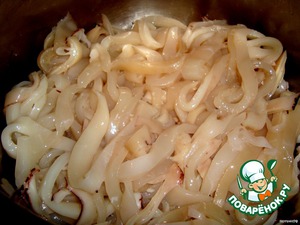 Кальмары залить кипящей водой и оставить на несколько минут, затем, под холодной водой вымыть и очистить от хитиновых пластин.
