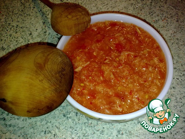 А зимой такую баночку открыла, добавила перекрученный чеснок и хрен и немного уксуса. Не совсем такая, как со свежими помидорами. Но все равно - очень вкусная. И надолго много места в холодильнике искать не надо