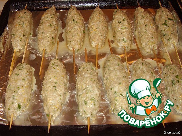 Противень застилаем двойной фольгой, из фарша формируем колбаски, протыкаем их палочками и укладываем на фольгу на небольшом расстоянии друг от друга, ставим в разогретую духовку (220*), примерно, на 15-20 минут