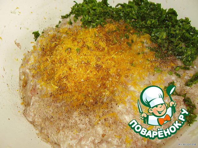 Натереть цедру апельсина, зелень петрушки очень мелко порубить ножом, добавить в фарш