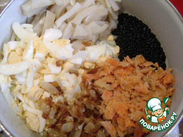 Яйца мелко нарезать, добавить чёрную икру и нарезанную сёмгу