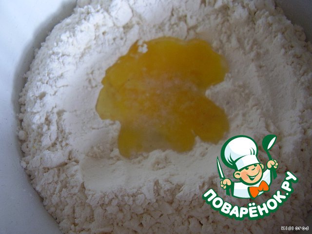 муку насыпаем в мисочку, делаем углубление, выливаем в него желток, добавляем щепотку соли