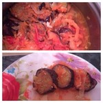 Выложить в кастрюлю слоями: баклажаны - заправка из овощей - баклажаны...