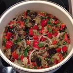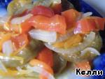 Когда баклажаны готовы, сделать заправку из лука, моркови и болгарского перца. Для этого все овощи нарезать крупно (перец полосочками, лук полукольцами, морковь натереть на крупной терке) и тоже немного поджарить. В конце к овощам добавить пропущенный через пресс чеснок. Можно и петрушку.