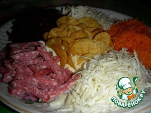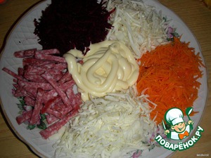 Капусту нашинковать, морковку и свеклу натереть (лучше использовать терку для корейской морковки), колбасу нарезать длинными брусочками.