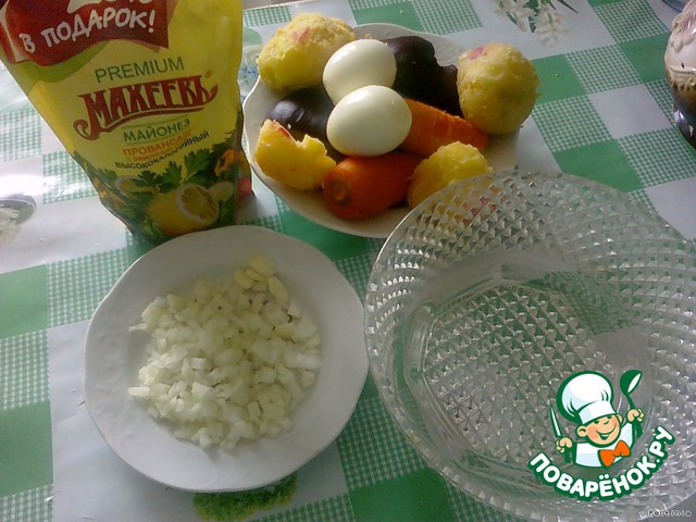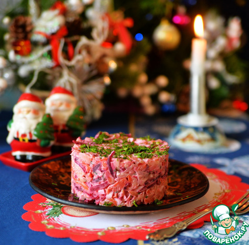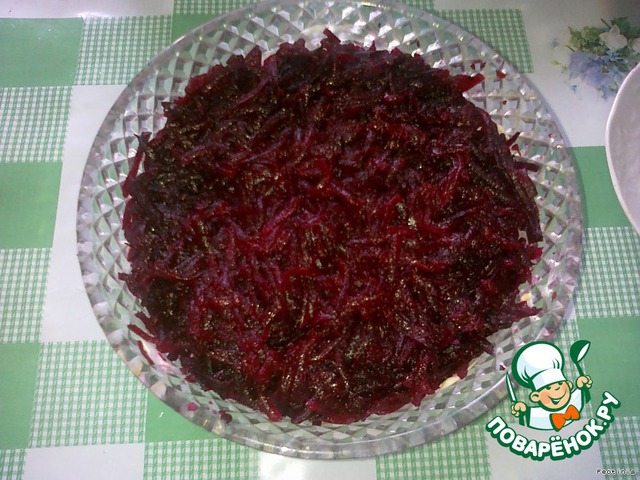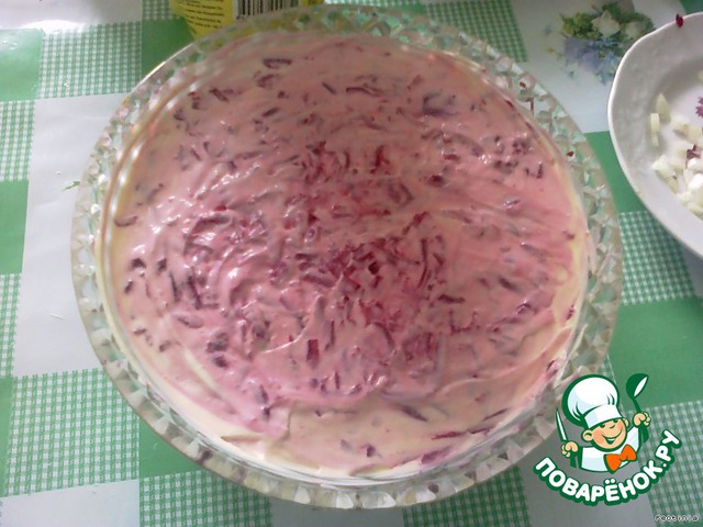 7. Слой свеклы хорошо покрываем майонезом. Вот так у нас должно получиться.