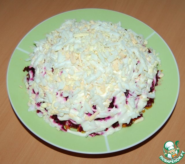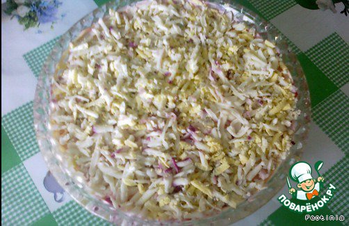 8. Теперь натираем на крупной терке 2 вареных яйца и наш салат готов! Необходимо на пару часов поставить его в холод, чтобы пропитался.