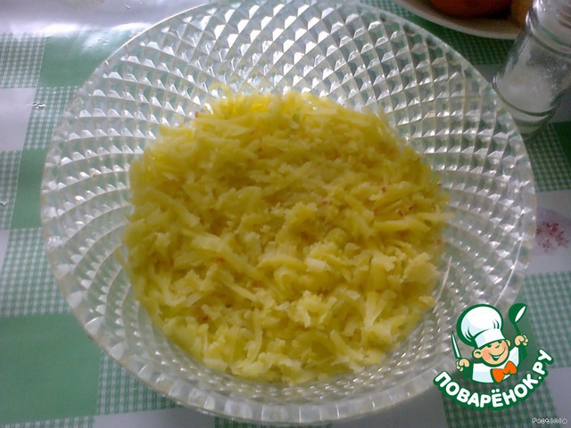 2. Натираем вареный картофель в салатницу на крупной терке и солим по вкусу.