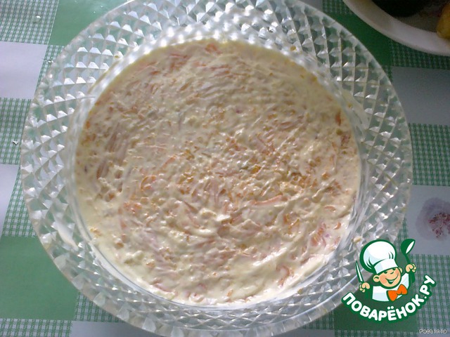 5. Слой моркови тоже хорошо смазываем майонезом и добавляем молотый чеснок.