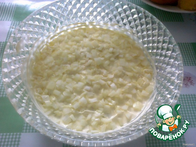 3. Слой картошки покрываем майонезом и посыпаем сверху мелко нарезанным репчатым луком.