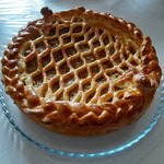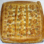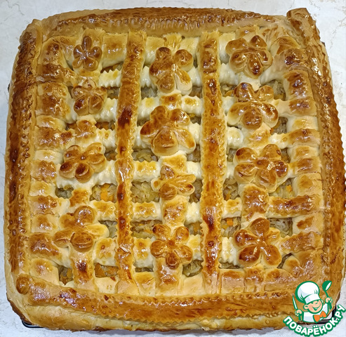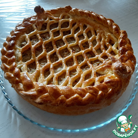 • 5. Раскатать оставшееся тесто, разрезать его на полоски. Выложить полоски на пирог в виде решетки. Защипать края. из остатков теста можно вырезать листики и лепестки, а затем украсить ими пирог. Подготовлены пирог накрыть полотенцем, оставить в теплом месте на 40 мин. (но я этого не делаю и все равно все получается). Разогреть духовку до 190 градусов. Смазать пирог желтком, поставить в духовку и выпекать 50 мин.