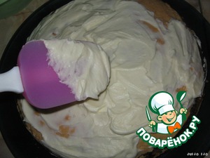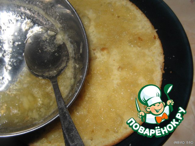 Корж разрезать на три части. Первую, пропитать половиной лимонного сиропа.