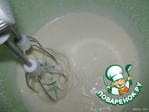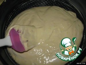 Муку просеять и смешать с разрыхлителем. Всыпать муку в тесто. Аккуратно смешать.