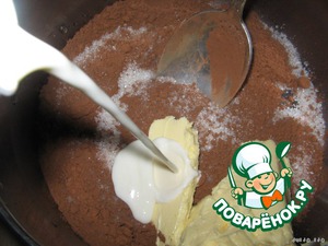 Для шоколадного крема (точнее будет назвать его помадкой), смешать сахар (50г.), какао, молоко и сливочное масло. При постоянном помешивании, варить до кипения. Помадка получается не густой, так и нужно.