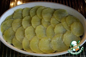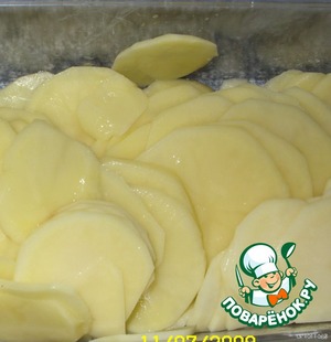 В форму выкладываем толченку, потом фарш, потом грибы, нарезанный картофель и слегка мажем майонезом
