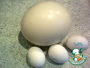 Вот оно страусиное яйцо. Для сравнения рядом лежат куриные
