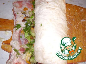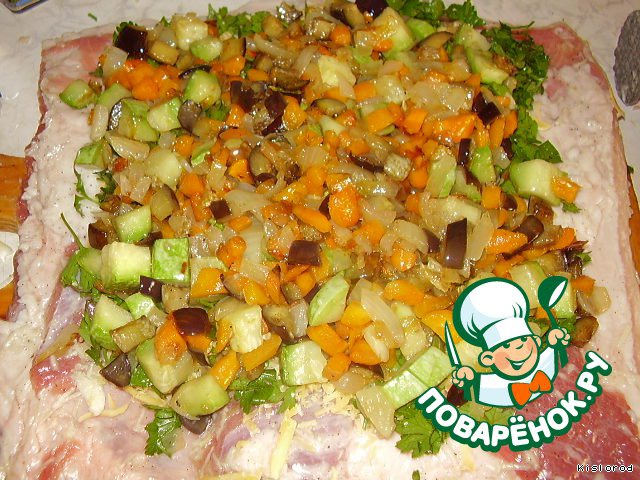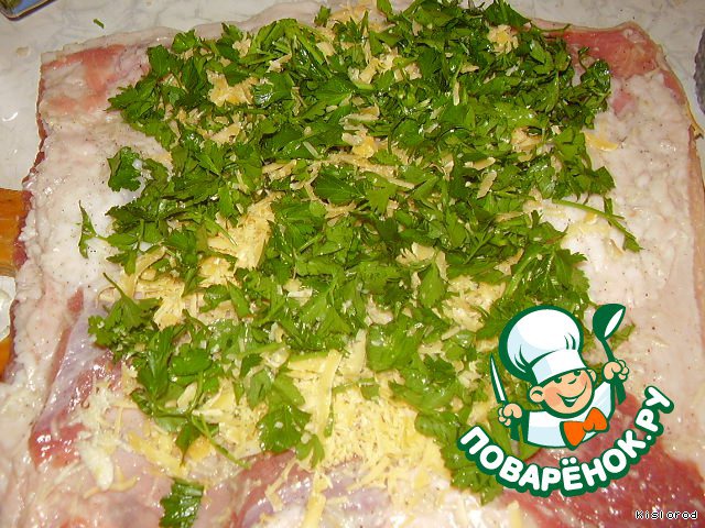 Хорошо натираем подчеревок этой смесью внутри, сверху вкладываем сыр, сверху зелень