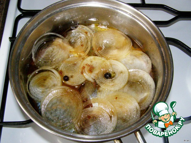 Сделал болтушечку из двух столовых ложек соевого соуса, чайной ложки уксуса и немного капнул туда вермута (зачем? не знаю, просто так, захотелось... :-)), добавил немного водички и вылил на карасей. Подумал, посыпал их щепоткой молотого имбиря, закрыл карасиков кружочками лука и вылил в них вышеназванное масло - карасиков почти покрыло. И на огонь. Как закипело - убрал газ на минимум (пришлось сбегать в хозмаг и купить рассекатель, а то сильно кипело) на 4 часа...