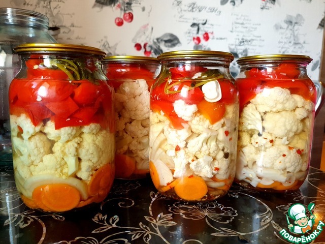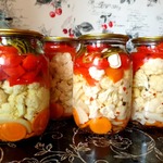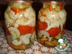 В подготовленные банки положить 2 бутона гвоздики,5 горошин перца. Овощи слоями:Морковь, огурцы, лук, помидоры, капусту, перец, чеснок.