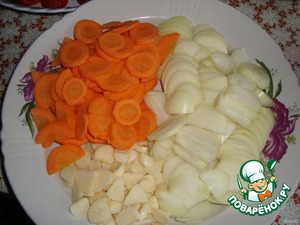Лук-полукольцами, морковь-колечками, чеснок-пластинками.