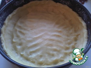 Форму для пирога смазываем сливочным маслом, немного присыпаем сахарной пудрой. Выкладываем тесто, формируем небольшие бортики и накалываем корж вилкой в нескольких местах. Если будете делать на противне или в неразъемной форме, подложите бумагу для выпечки, иначе трудно будет вынимать пирог.