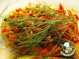 Порезать лук мелко, морковь- небольшой соломкой, болгарский перец и помидор небольшими кубиками. Чеснок и зелень измельчить.