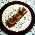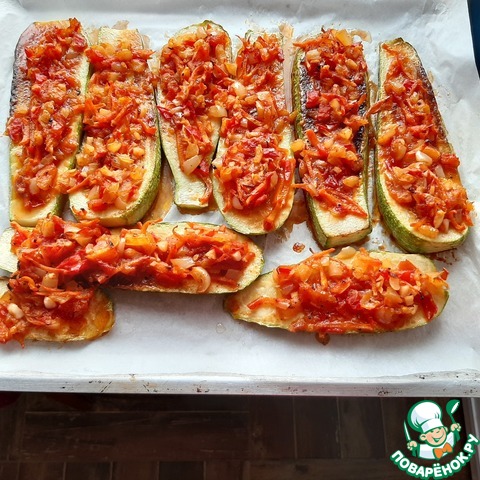 Кабачок порезать на две части. Каждую нарезать вдоль, посолить. Промакнуть и обжарить в сковороде, на растительном масле с двух сторон.