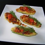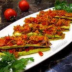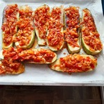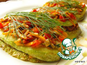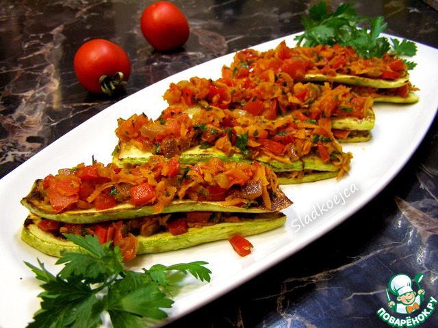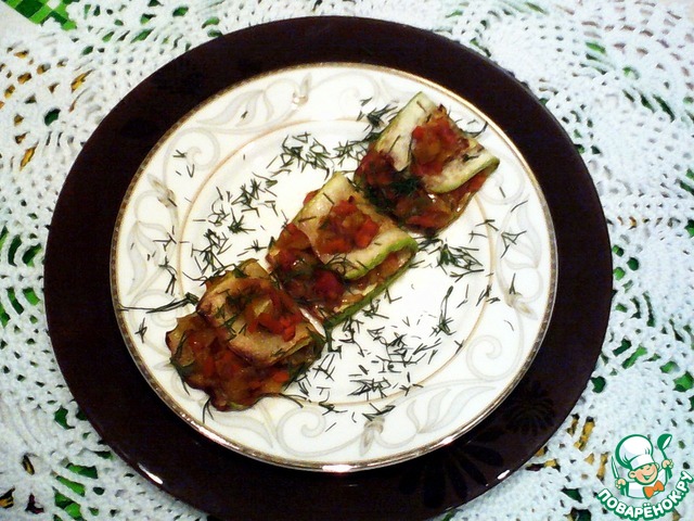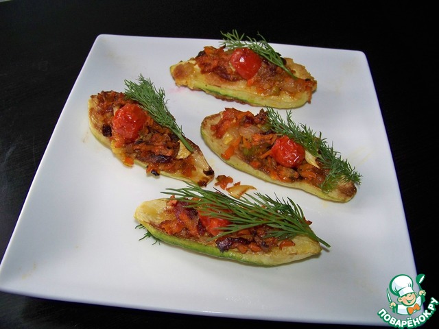 Выложить начинку на кабачки в два слоя, украсить веточкой укропа.