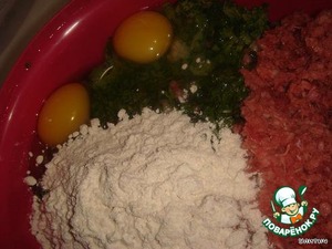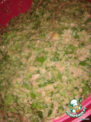 Теперь надо соединить все ингредиенты фарша. К измельченным брокколи и зелени добавляем говяжий фарш, яйца, муку. Тщательно перемешиваем. Замоченные предварительно 2 кусочка хлеба, я замачивала в молоке, отжимаем от лишней жидкости, если необходимо. Добавляем к фаршу. Вымешиваем.