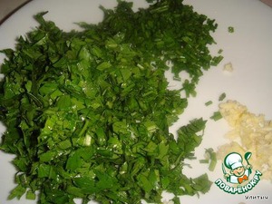 Нашинковать зеленый лук, петрушку. Чеснок выдавить через чеснокодавку.