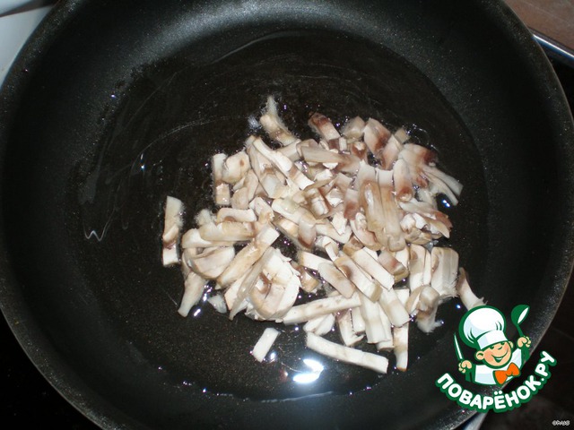 обжарить мелко нарезанные шампиньны, затем добавить к ним измельченный чеснок |
