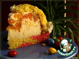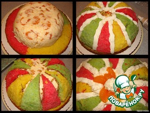 Для украшения сделала крем (150 мл сливок, 50 гр сахарной пудры и 100 гр творога), закрыла соединения между цветными сегментами, нарисовала полосу внизу и вверху торта. Верхушку украсила отложенными мандариновыми дольками. -