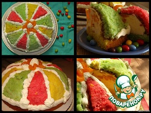 ... вот я и подумала, а что, если сделать разноцветный торт в виде циркового шатра, но вместо пищевых красителей взять желе с разными вкусами. Придумано - сделано...