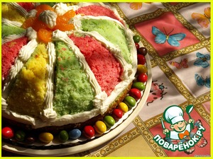 Уж который раз говорю себе: "Все!!! это мой последний торт... ", но приходит в голову очередная идея - и я опять на кухне... Торт "Радуга" от Вики своей красочностью напомнил мне о цирке. Не знаю, ходят ли нынешние дети в цирк, а в моем детстве приезд цирка в город был праздником. Вот я и подумала, а что, если сделать разноцветный торт в виде циркового шатра...