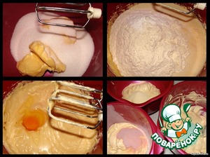 Теперь пришел черед теста: мягкий (НЕ РАСТОПЛЕННЫЙ) маргарин взбиваем с сахаром и ванилином. Продолжая взбивать, по одному добавляем яйца, затем молоко и муку с разрыхлителем.