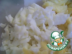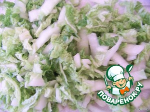 Пекинскую капусту режем не очень мелко, солим и слегка мнем руками, чтобы стала мягче и слегка дала сок
